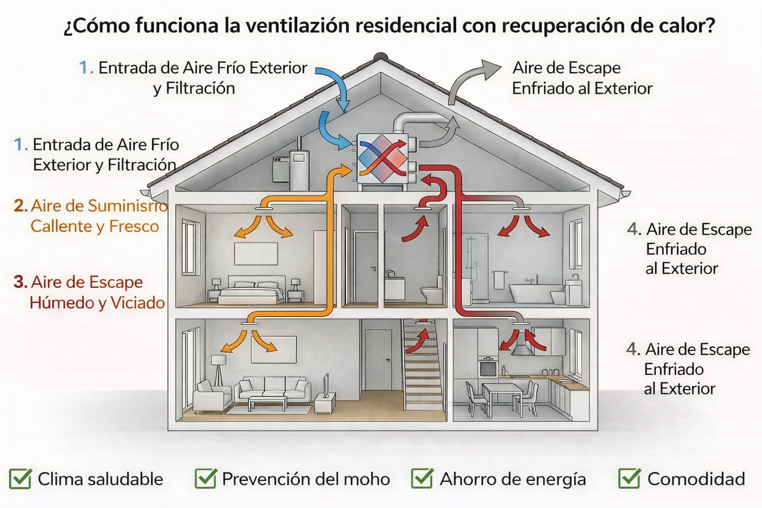 Imagínese: en lugar de abrir y cerrar constantemente las ventanas, el sistema se encarga de extraer el aire viciado (con CO₂, humedad, olores, polvo, etc.) y, al mismo tiempo, de introducir aire fresco y filtrado del exterior.